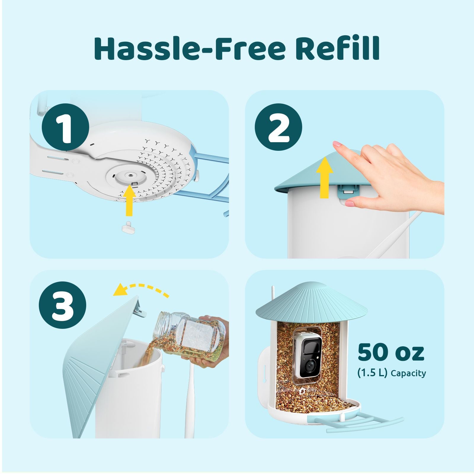 With a wide, easy-access lid and a spacious seed container, allowing you to refill in just a few seconds—no mess, no stress.