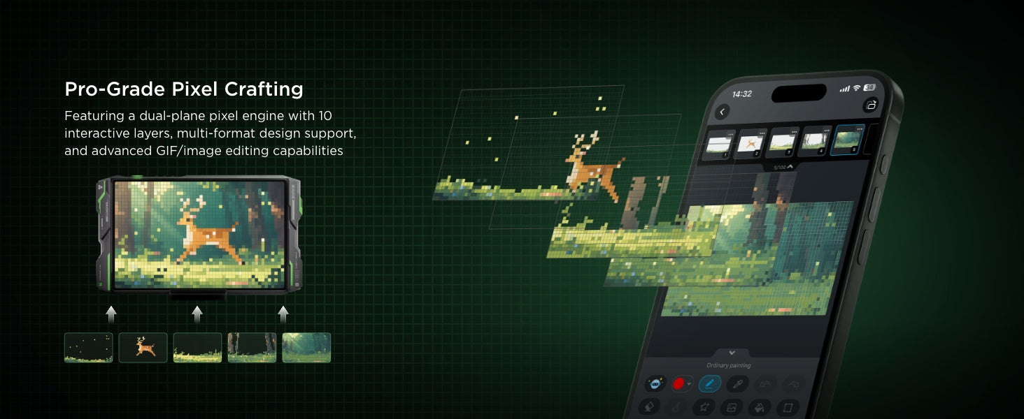 Show off pixel-perfect animations, emojis, or game-inspired art on a vibrant 1024-pixel LED matrix running at 30fps.